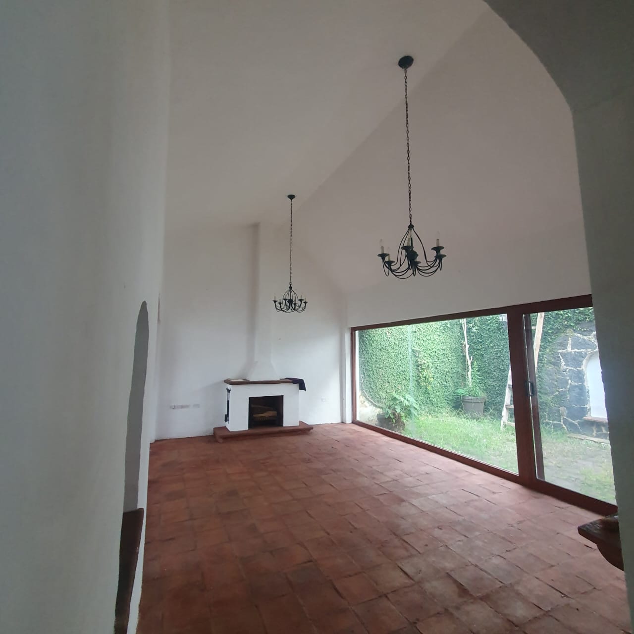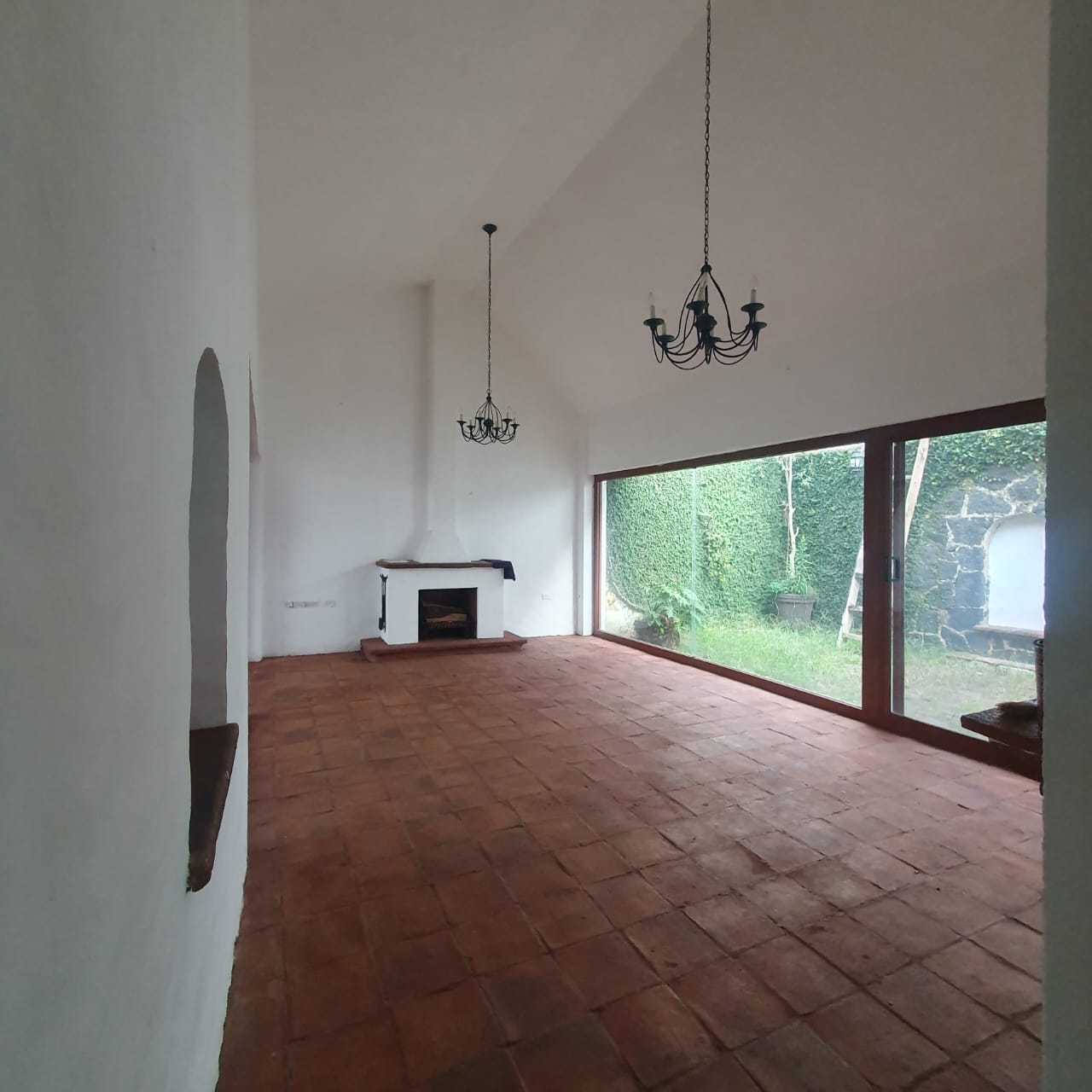 Sala comedor amplia con chimenea y hermosos ventanales que dejan ver la fuente y el jardin